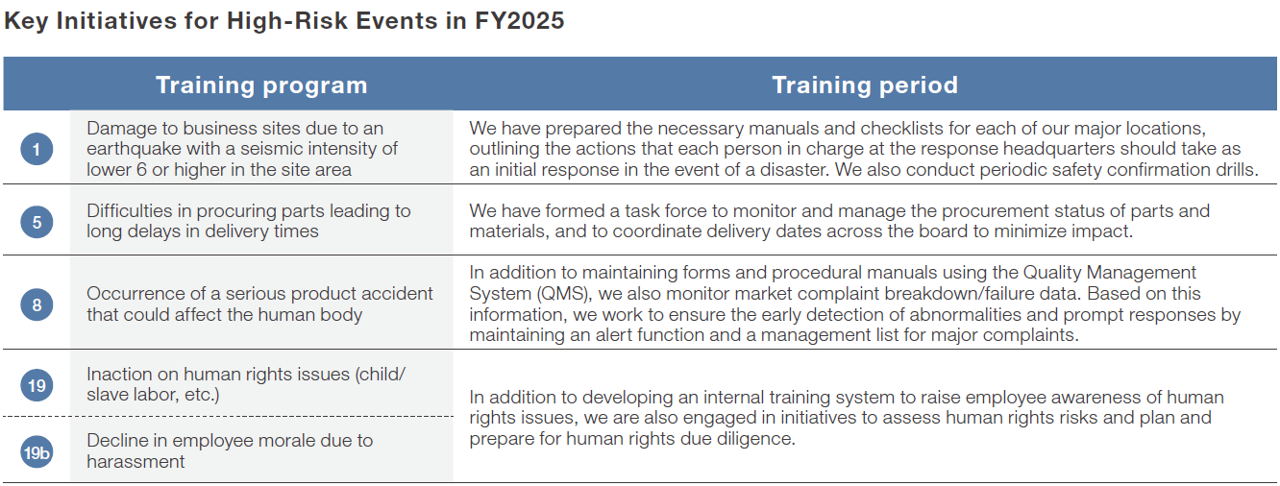 为应对地震等自然灾害(IDEC集团的高风险事件之一),在风险管理委员会内成立了一个筹备小组委员会,推动制定BCP,并与目标地点的生产部门和相关方合作,推动制定基本的灾害应对政策、初步应对流程和业务连续性计划委员会正在推动制定灾害发生时的基本政策、初步响应流程和业务连续性计划。